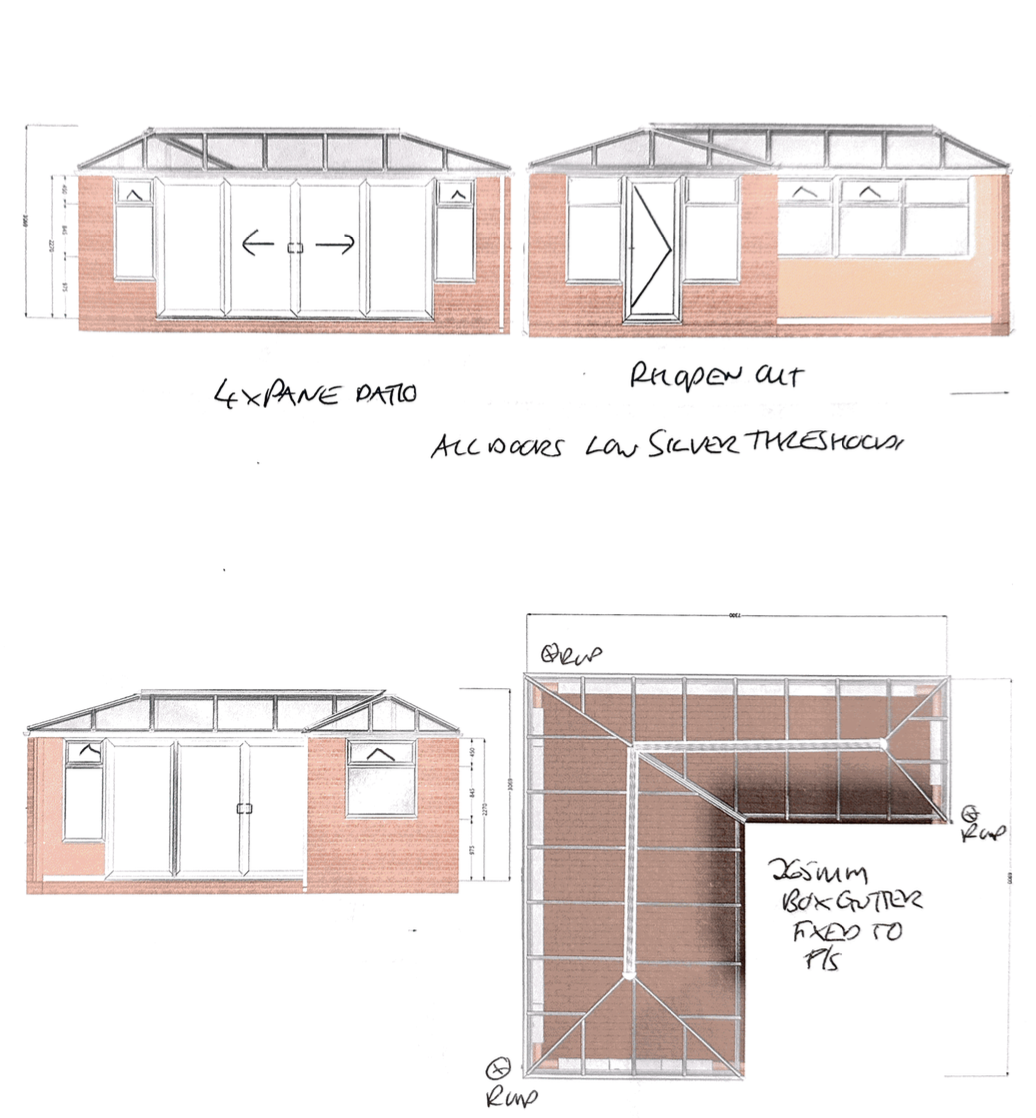 We proposed a complete rebuild, starting from the base up. A full Edwardian-style structure was designed with an L-shaped footprint, giving the clients a generous layout for their dining area. Corner pillars added a sense of permanence and strength, while a double Edwardian roof with solar glass brought in maximum natural light. The roof height lifted the whole room, creating an airy feel that blended perfectly with the bungalow’s proportions. Matching brickwork ensured visual continuity, giving the new space a solid, built-to-last look.